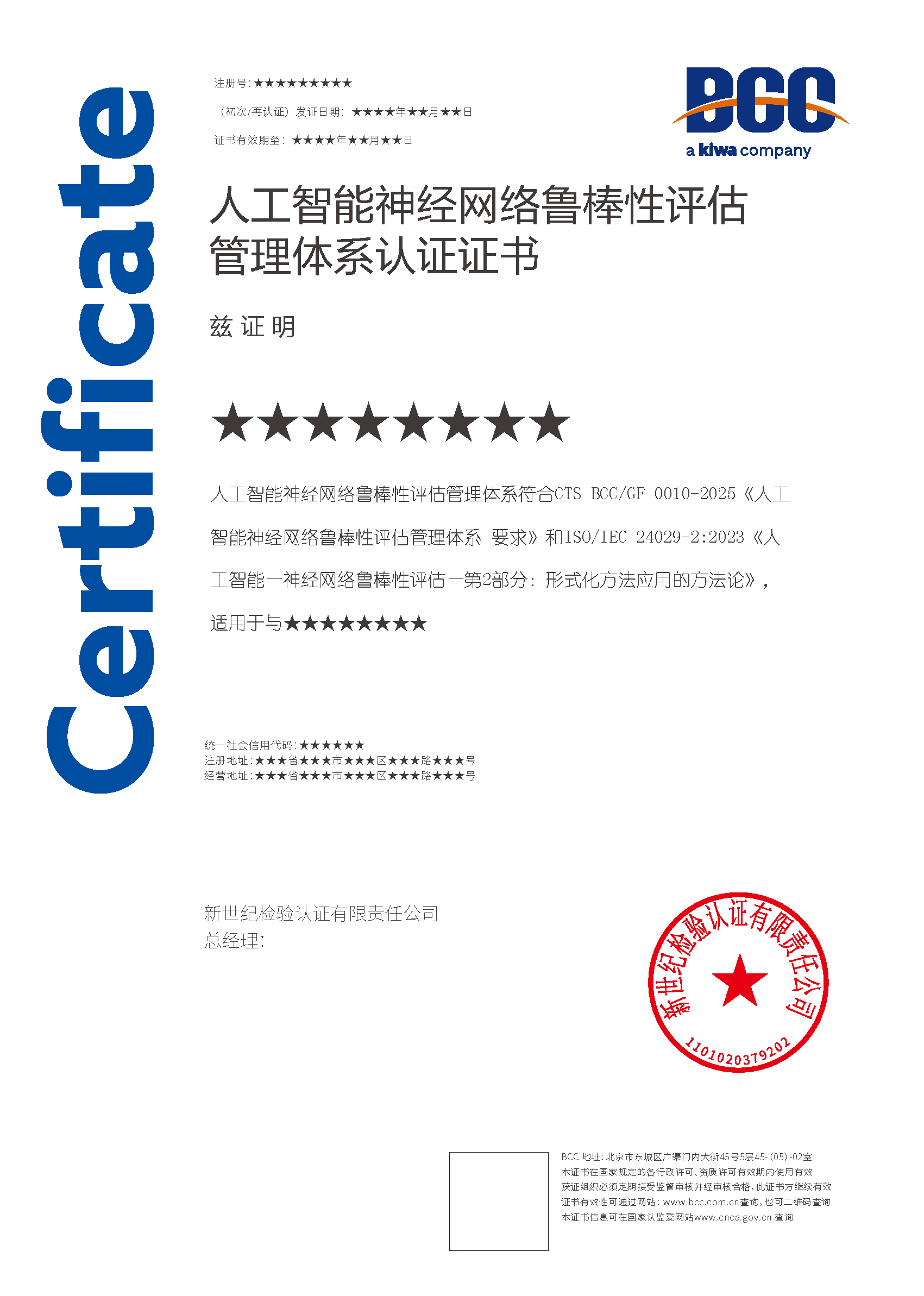 本頁涉及的認證服務中均有對應的《認證實施規則》,BCC擁有其最終解釋權。任何組織及個人未經BCC許可,不得以任何形式全部或部分使用(法律要求除外)認證相關信息。如需獲取相關實施規則請用以下方式聯系獲取:電話:010-58579316 郵箱:fwjs@kiwa.cn